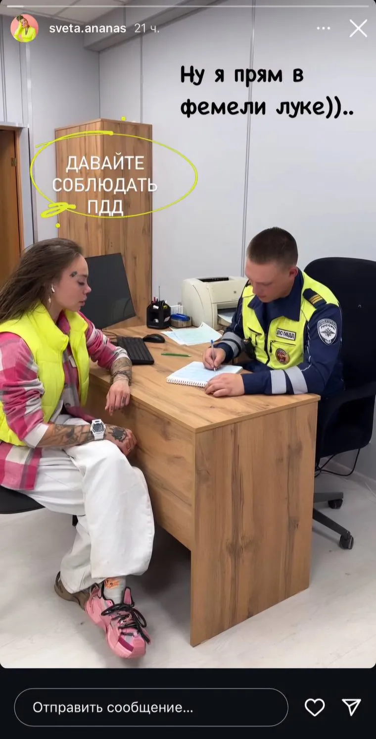 «В общем, выписали мне штраф. Так делать нельзя. Не берите плохой пример с меня», — сказала блогерша в сторис в соцсети Instagram (запрещен в России, принадлежит компании Meta, признанной экстремистской и запрещенной в России).