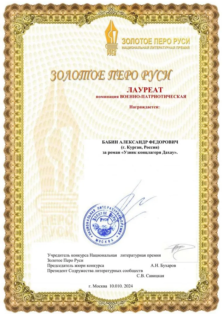 «На конкурс было прислано 35 тысяч произведений из 75 стран. Я стал лауреатом в номинации „военно-патриотическая“ за роман „Узник концлагеря Дахау“. Ранее лауреатами конкурса становились, например, такие писатели как Захар Прилепин и Сергей Лукьяненко», — сообщил агентству Бабин.