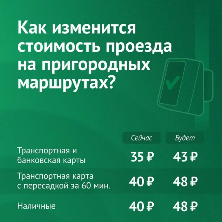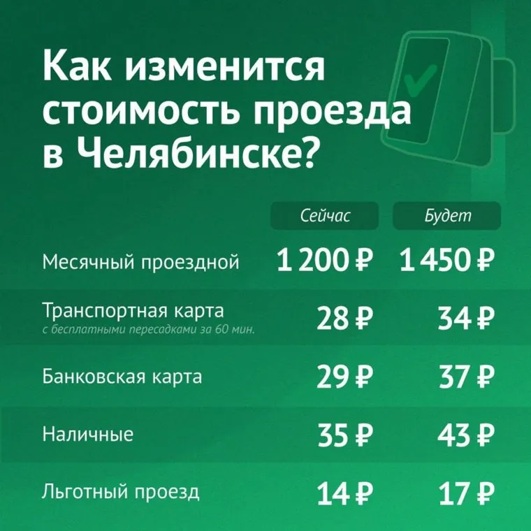 На межмуниципальных маршрутах Челябинска, Копейска и Сосновского муниципального района стоимость проезда увеличится на восемь рублей. По транспортной карте цена увеличится с 35 до 43 рублей, при оплате наличными — с 40 до 48 рублей. На межмуниципальных маршрутах вне Челябинской агломерации стоимость проезда одного километра в среднем вырастет на 18,4% — с 3,76 до 4,45 рубля.