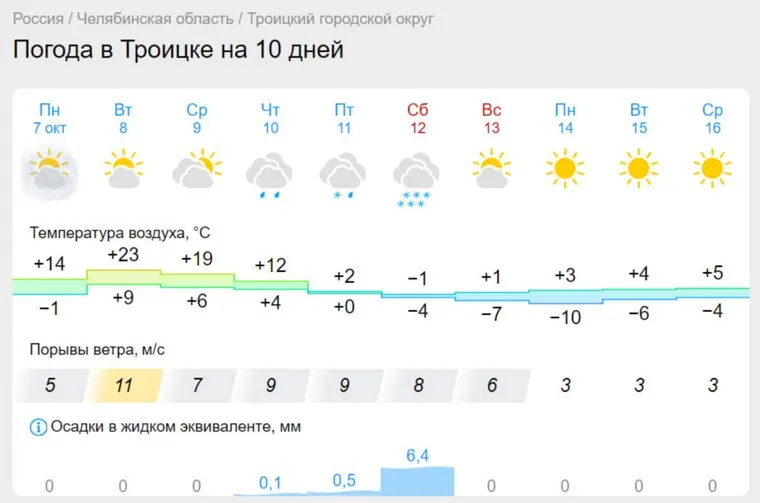 В Магнитогорске 10 октября пройдет сильный дождь, обильных снегопадов на 11 и 12 октября не предвидится. Вероятен мокрый снег высотой до двух сантиметров, который быстро растает. В Аше синоптики обещают аналогичную погоду.