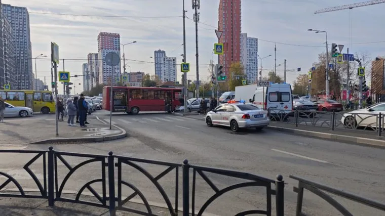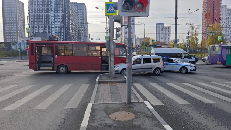 Автобус с пассажирами снес легковушку в Екатеринбурге, движение встало. Фото