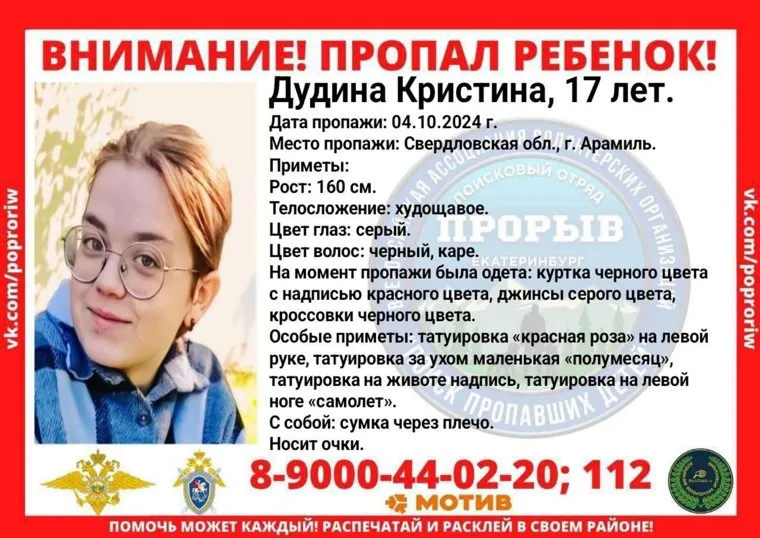 В Арамиле (Свердловская область) 4 октября пропала 17-летняя Кристина Дудина. На ее поиски вышли силовики и волонтеры. У пропавшей есть четыре татуировки. Об этом рассказали в спасательном отряде «Прорыв».