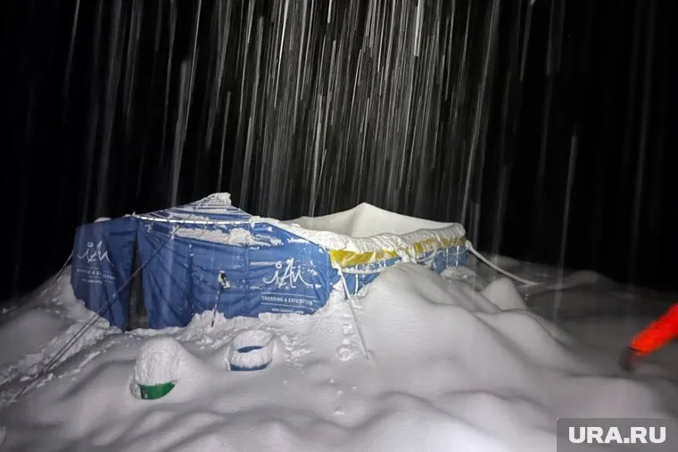 На двадцать восьмой день выпало больше полутора метров снега, палатки засыпало. Крыша кухни провалилась под тяжестью снега, алюминиевые стойки прогнулись. Члены экспедиции в течение полутора часов откапывали лагерь и кухню.