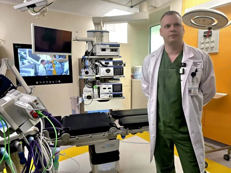 Заведующий эндоскопическим отделением НОКБ Михаил Рыжиков в операционной, которая не уступает столичной