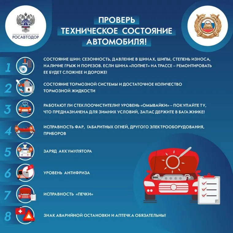 Специалисты ведомства подготовили инфографику для водителей, которые вынуждены отправляться в дорогу при непогоде. Чек-ап лист включает в себя необходимый минимум проверок и перечень предметов, которые стоит взять с собой.