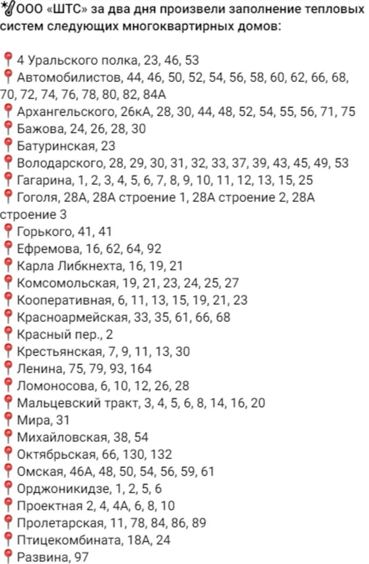 «ООО „ШТС“ за два дня произвели заполнение тепловых систем более чем в 230 многоквартирных жилых дома. По информации энергокомпании подключение продолжается», — сообщается в telegram-канале администрация Шадринска.