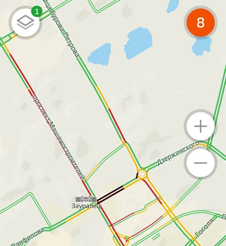 «Наибольшее скопление автомобилей зафиксировано на улице Коли Мяготина, от Володарского до Пролетарской, а также на Пролетарской — от Гоголя через проспект Машиностроителей до проспекта Маршала Голикова», — указывает сервис «2ГИС».