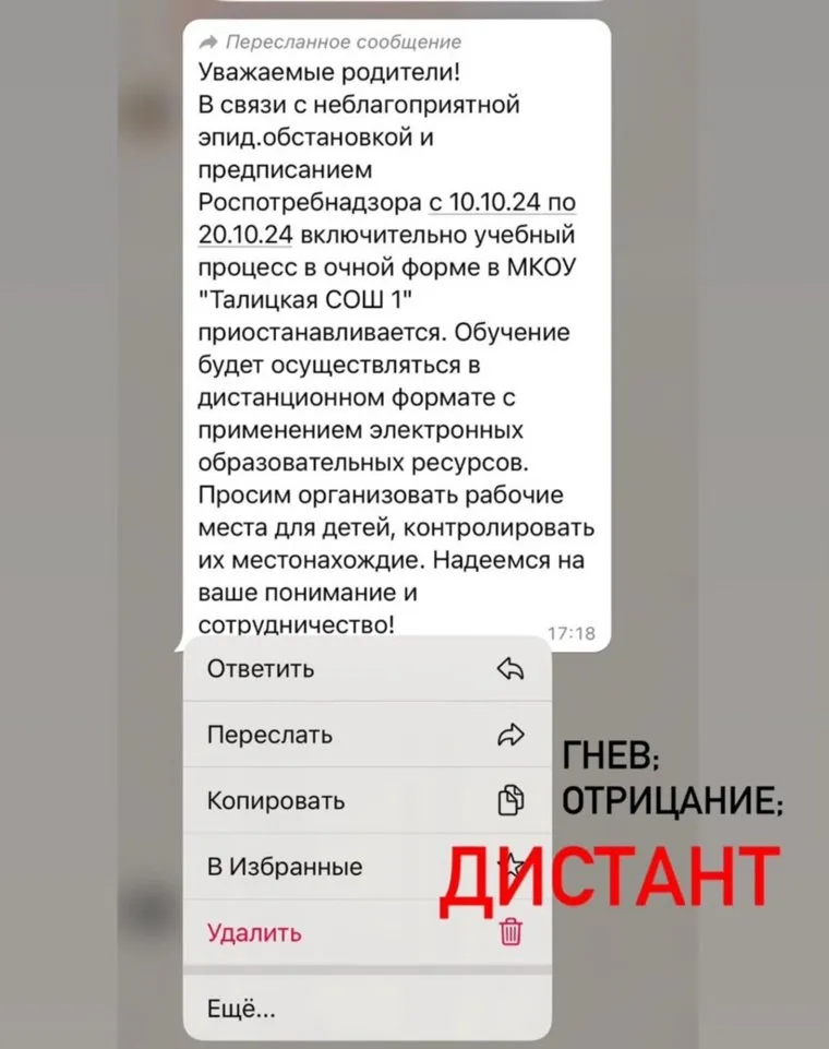 «В связи с неблагоприятной эпидемиологической обстановкой и предписанием Роспотребнадзора с 10.10.24 по 20.10.24 включительно учебный процесс в очной форме в МКОУ „Талицкая СОШ № 1“ приостанавливается. Обучение будет осуществляться в дистанционном формате», — рассказали мама учащегося в группе «Подслушано Талица № 1».