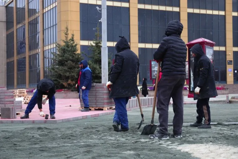 Ремонты в центре Екатеринбурга провалены повторно: рабочие укладывают плитку в снег. Фото