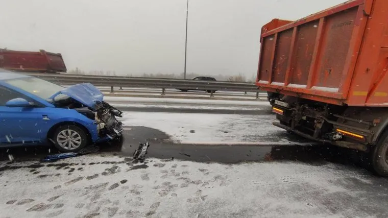 Первым ДТП стало столкновение легкового автомобиля с грузовиком. Водитель Hyundai догнал «Камаз», обошлось без серьезных последствий