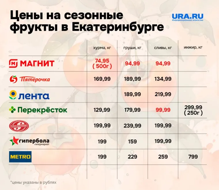 Цены на сезонные фрукты в Екатеринбурге варьируются в зависимости от точек продаж, например, в «Магните» хурму продают за 74 рубля, а сливы в «Перекрестке» — за 99 рублей. Корреспондент URA.RU изучил ассортимент сезонных фруктов в известных супермаркетах города и выяснил, где самые бюджетные цены. Подробнее — в инфографике.