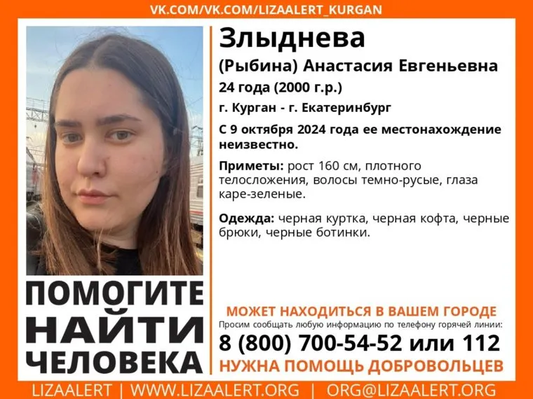 «Внимание! Помогите найти человека! Анастасия Злыднева (Рыбина), 24 года (2000 год рождения), город Курган — город Екатеринбург. С 9 октября ее местонахождение неизвестно», — говорится в сообщении.