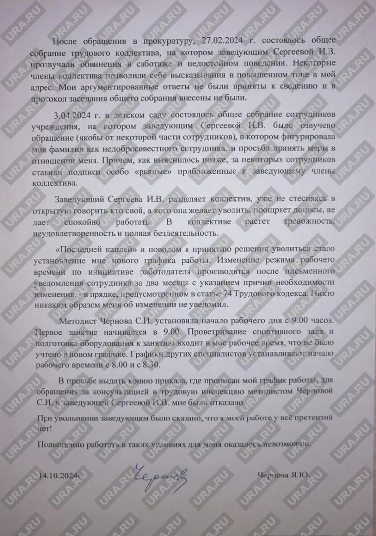 «Уволились два воспитателя и повар, а также инструктор по физической культуре и специалист высшей категории Яна Чернова. В общей сложности — уже 14 человек. Ждем итоги проверки от департамента образования», — сообщила корреспонденту URA.RU воспитатель группы компенсирующей направленности детсада «Золотая рыбка» Марина Серкина.