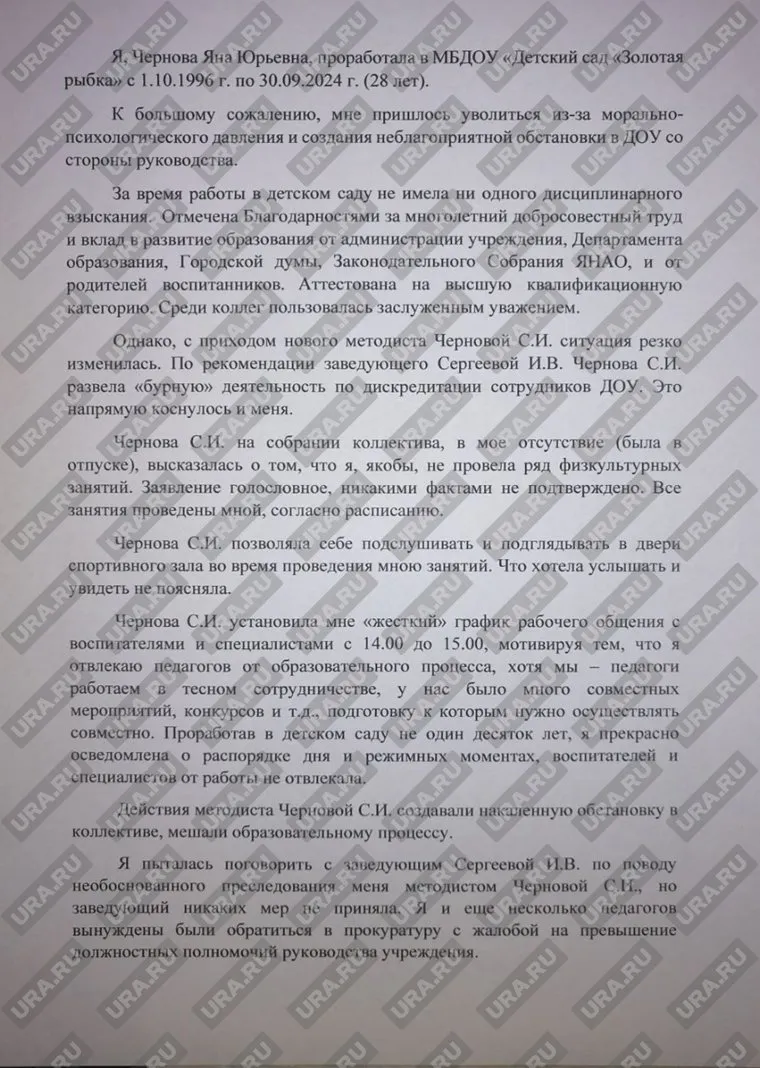 Представитель депобразования также сообщил, что официальных жалоб от родителей на работу детского сада «Золотая рыбка» не поступало. Однако за период с 2023 года по 2024 год зарегистрировано три обращения педагогов в прокуратуру Салехарда и одно в депобразования.