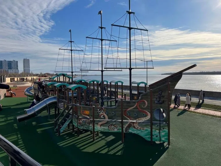 На нижнем ярусе набережной разместили игровой комплекс в форме большого корабля. Строительство велось в рамках национального проекта «Жилье и городская среда» и федеральной программы по формированию комфортной городской среды.