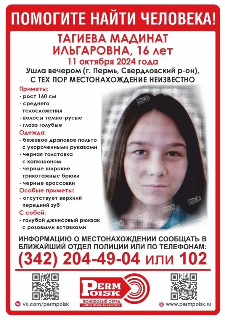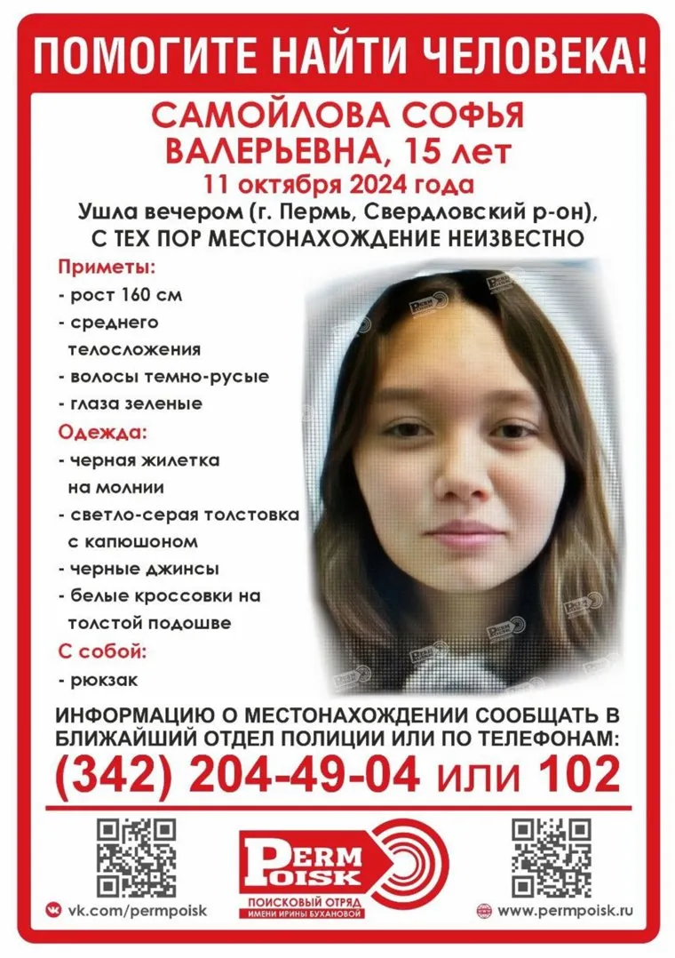 «Ушли вечером 11 октября 2024 года. Город Пермь, Свердловский район. Сейчас местонахождение неизвестно», — написано в telegram-канале поискового отряда.