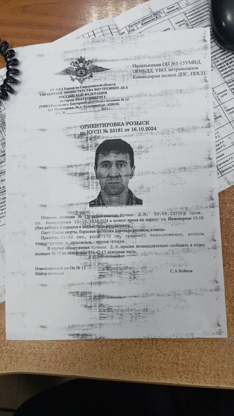 «Отделом полиции №13 разыскивается Кучин Дмитрий Михайлович, 30.05.1979 года рождения. Ночью 16 октября по адресу: ул. Инженерная, 10-15 убил ребенка и скрылся в неизвестном направлении», — следует из ориентировки.