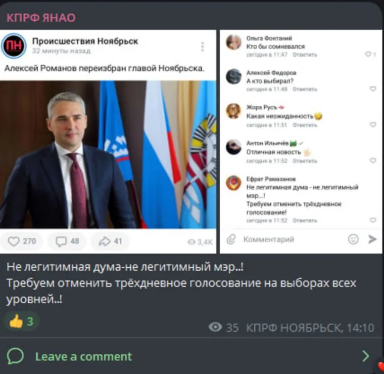 «Нелегитимная дума — нелегитимный мэр! Требуем отменить трехдневное голосование на выборах всех уровней», — говорится в сообщении. Коммунисты до конкурса на должность мэра ранее критиковали систему трехдневных выборов и признавали только прямое голосование за глав города и муниципалитетов.