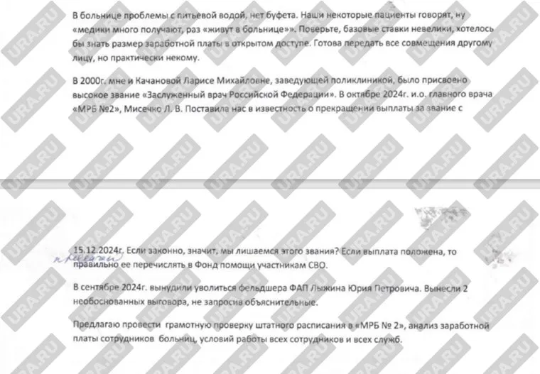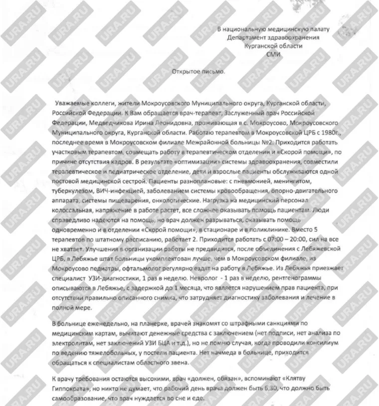 Заслуженные врачи РФ из Межрайонной больницы №2 села Мокроусово Курганской области, которых хотят лишить почетного звания и выплат, написали жалобу президенту Национальной медицинской палаты Леониду Рошалю. Об этом корреспонденту URA.RU рассказали источники из медицинской сферы, предоставив обращение работников медучреждения.
