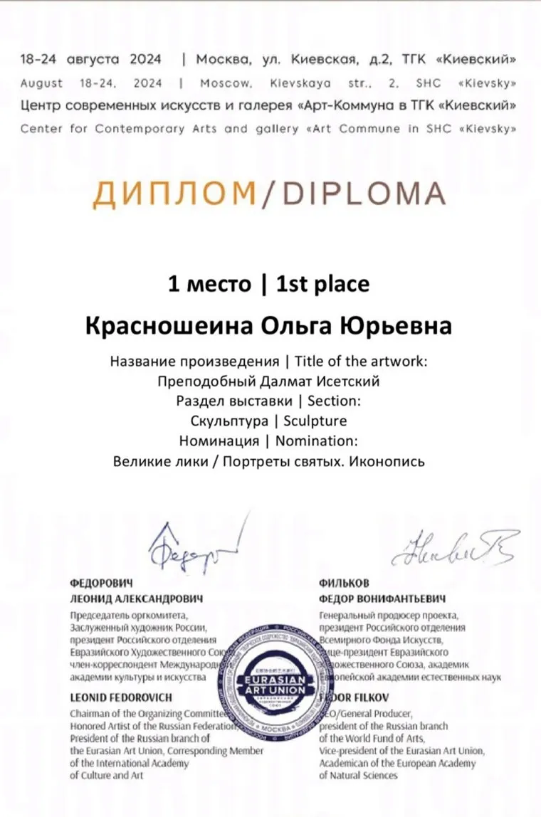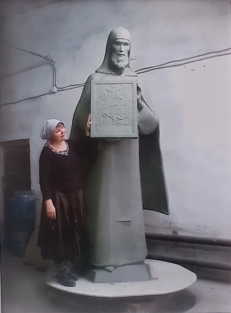 «Я отправила фотографию скульптуры преподобного Далмата Исетского на международную выставку современного духовного искусства в Москву и заняла первое место. Сам памятник в бронзе стоит в центре Далматовского монастыря и встречает паломников», — говорится в посте, опубликованном на странице скульптора в соцсети «ВКонтакте».
