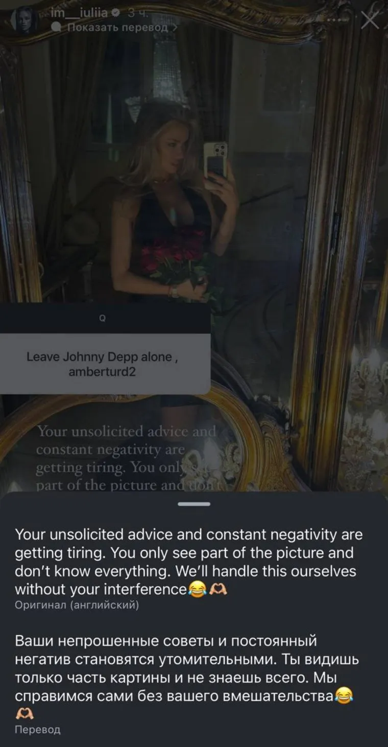 «Оставь Джонни Деппа в покое. Эмбер Херд 2», — написал ей подписчик. «Ваши непрошенные советы и постоянный негатив начинают утомлять. Ты видишь только часть картины и не знаешь всего. Мы справимся и без вашего вмешательства», — ответила Власова на своей странице в Instagram (соцсеть принадлежит компании Meta, которая признана экстремистской и запрещена в РФ).