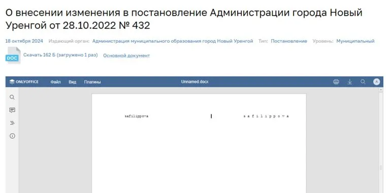 «В заголовке написано „О внесении изменения в постановление Администрации города Новый Уренгой от 28.10.2022 № 432“. Ниже находятся фамилия, имя и отчество сотрудника мэрии», — сообщает читатель URA.RU.
