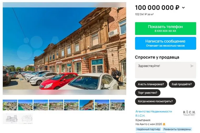 «Продаю двухэтажное здание в центре города. Является объектом культурного наследия — памятник архитектуры 19 века», — сообщается на сайте «Авито».