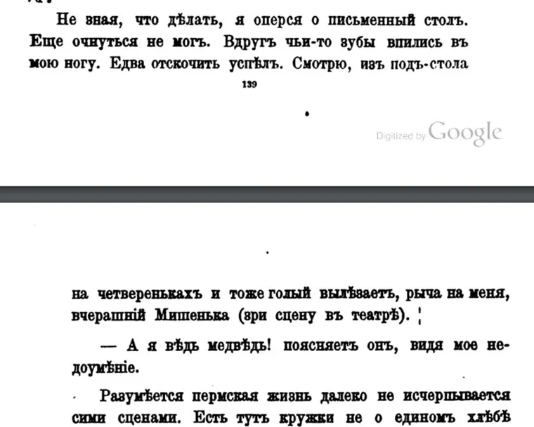 «Вдруг чьи-то зубы впились в мою ногу. Едва отскочить успел. Смотрю, из-под стола на четвереньках и тоже голый вылезает, рыча на меня, вчерашний Мишенька... „А я ведь медведь!“ — поясняет он, видя мое недоумение», — пишет путешественник. Но добавляет, что «пермская жизнь далеко не исчерпывается сими сценами».