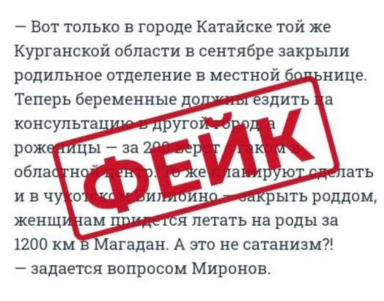 Правительство Курганской области опровергло заявление депутата Госдумы Сергея Миронова о закрытии родильного отделения в Катайске и его заявлении о пособничестве движению чайлдфри. Власти сообщили, что информация о «оптимизации» и направлении всех рожениц в областной перинатальный центр не соответствует действительности, указано в канале «Курганская область официально». При этом власти признают, что родильное отделение в Катайске сейчас не работает, а врача в поликлинике давно нет.