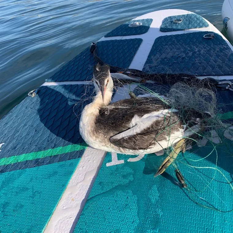 Сапбордисты Челябинска спасли запутавшуюся в сетях чомгу. Фото