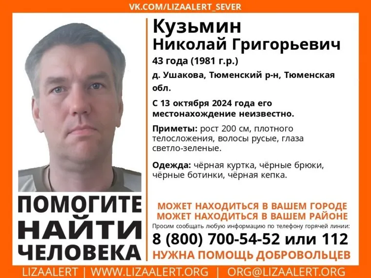 «Пропал Кузьмин Николай, 43 года. Деревня Ушакова, Тюменский район, Тюменская область. С 13 октября 2024 года его местонахождение неизвестно», — сообщили в группе отряда в соцсети «ВКонтакте».