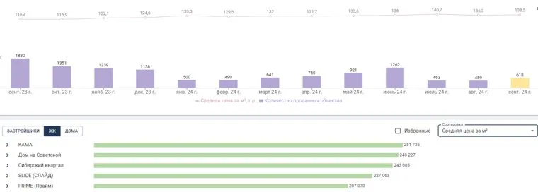 Уточняется, что всего в сентябре в новостройках было продано 618 квартир. Кроме ЖК «Кама» в топ-5 самых дорогих комплексов вошли «Дом на Советской» (248,2 тысячи рублей за «квадрат»), «Сибирский квартал» (243,6 тысячи рублей), Slide (227 тысяч рублей) и Prime (207 тысяч рублей). По мнению директора аналитического центра «КД-Консалтинг» Алексея Скоробогача, снижение цен на дома класса «бизнес» в ближайшее время не предвидится, так как при строительстве этих объектов используют материалы и оборудование, которое только дорожает.