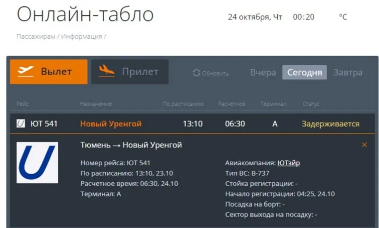 «Авиакомпания Utair, рейс ЮТ451 Тюмень — Новый Уренгой. Время вылета по расписанию — 23.10.24 в 13:10, расчетное время вылета — 24.10.24 в 6:30», — сообщается на онлайн-табло воздушной гавани Тюмени.