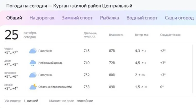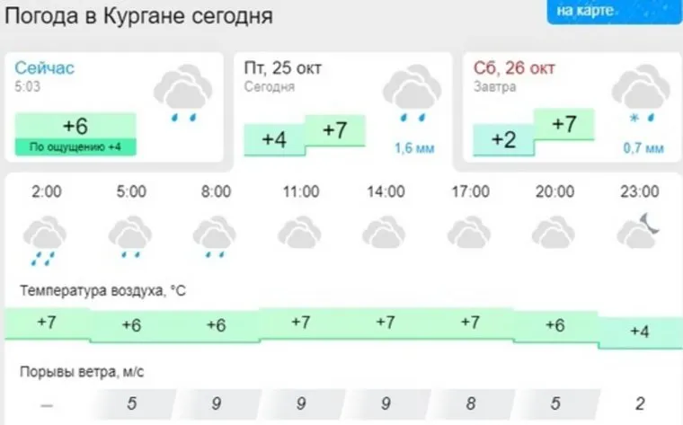 В Кургане 25 октября будет сыро: влажность воздуха достигнет 89%, синоптики обещают дождь. Об этом свидетельствуют сервисы погоды Gismeteo и Яндекс.Погода.