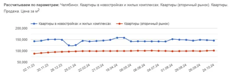 «В Челябинске с 10 по 24 октября цены на квартиры в новостройках снизились в цене на 3% до 145 тысяч 500 рублей за квадратный метр. При этом квартиры на вторичном рынке подорожали на те же 3% до 102 тысяч рублей за квадрат», — следует из динамики цен на сайте «Restate».