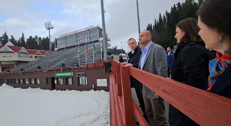 Осмотр биатлонной трассы. Слева направо: губернатор ХМАО Руслан Кухарук, полпред в УрФО Артем Жога, директор депспорта Софья Конух, замгубернатора Елена Майер