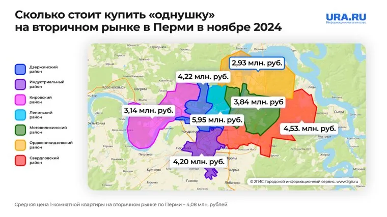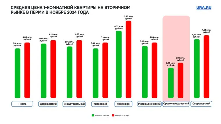 «В Перми с ноября 2023 года по ноябрь 2024 года средняя стоимость однокомнатных квартир на вторичном рынке выросла на 7,09% и достигла 4,08 млн рублей. Дешевле „однушки“ продают в Орджоникидзевском районе (2,93 млн рублей). На втором месте — Кировский район (3,14 млн рублей). На третьем — Мотовилихинский (3,84 млн рублей)», — рассказал Алексей Попов корреспонденту агентства.