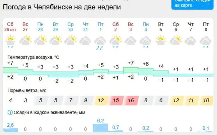 В Челябинске в последнюю неделю октября осадков не ожидается. Дожди начнутся ближе к выходным — началу ноября. Поднимется ветер. Об этом сообщили в своем прогнозе синоптики «Гисметео».