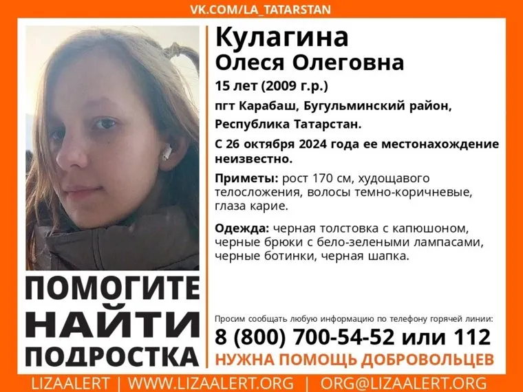 «Может находиться в Свердловской области! Пропала Олеся Кулагина, 15 лет (2009 года рождения). Место пропажи: поселок городского типа Карабаш, Бугульминский район, Республика Татарстан. Дата пропажи: с 26 октября ее местонахождение неизвестно», — говорится в сообщении.