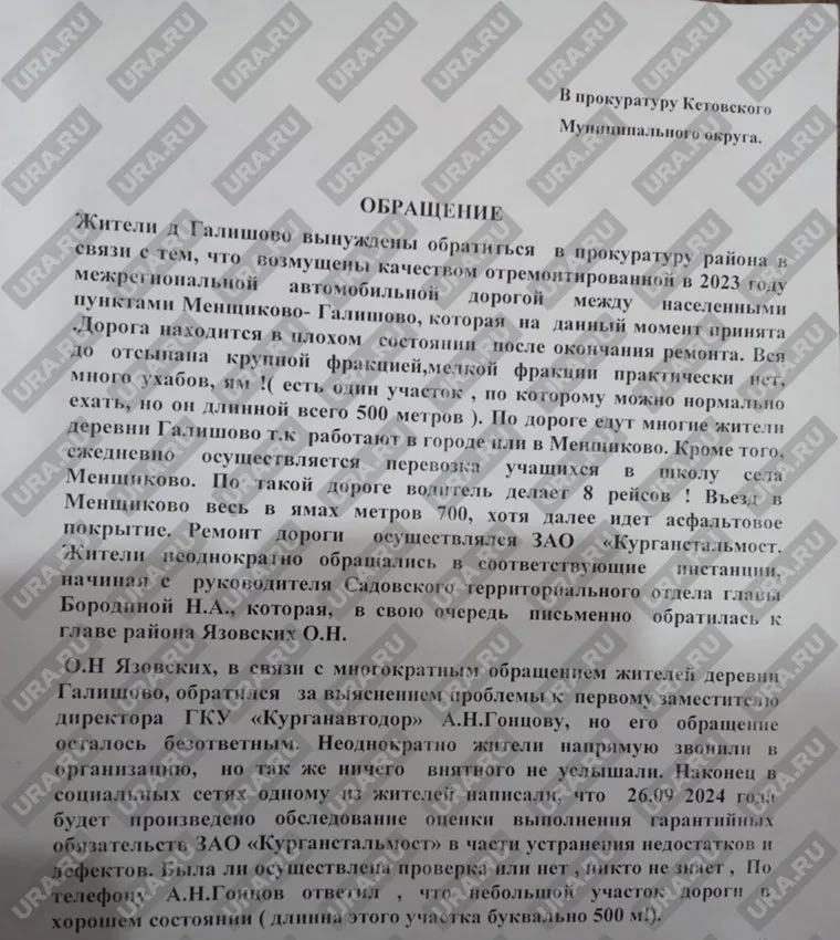 К работе скандальной госкомпании «Курганавтодор», подчиняющейся заместителю губернатора Константину Малышеву и директору департамента ЖКХ Ирине Саблуковой, появились новые претензии. Жители деревни Галишово написали обращение в прокуратуру из-за некачественного ремонта дороги, заказчиком которого была правительственная фирма, а генподрядчиком любимый застройщик властей — «Курганстальмост». Об этом корреспонденту URA.RU рассказали местные жители и предоставили обращение.