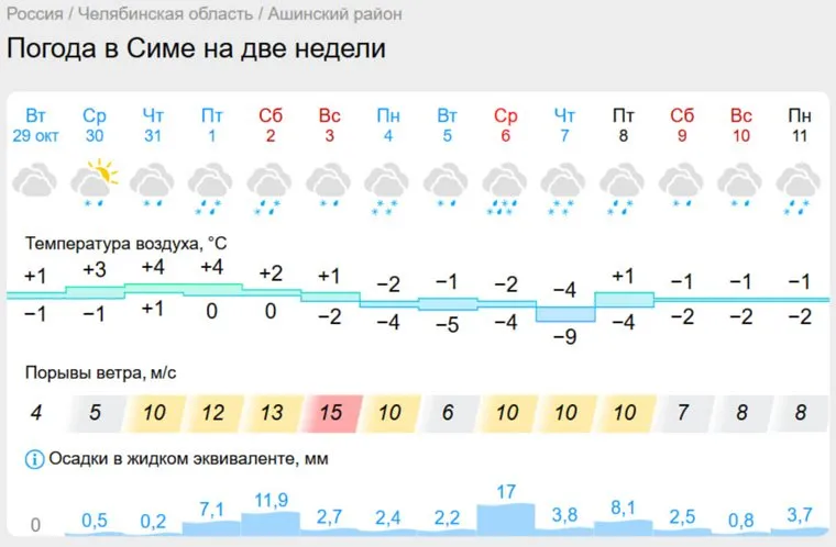 «В Симе снег начнется 30 октября и будет идти предстоящие две недели, регулярно усиливаясь. Наиболее мощные снегопады ожидаются 1-2 и 6—8 ноября, суммарно выпадет до 50 мм смешанных осадков. В Аше снежный буран пройдет трижды — 1—2 ноября, 6 и 8 ноября, при этом последний ожидается наибольшей силы — до 17,1 мм осадков за сутки», — говорится в прогнозе погоды.