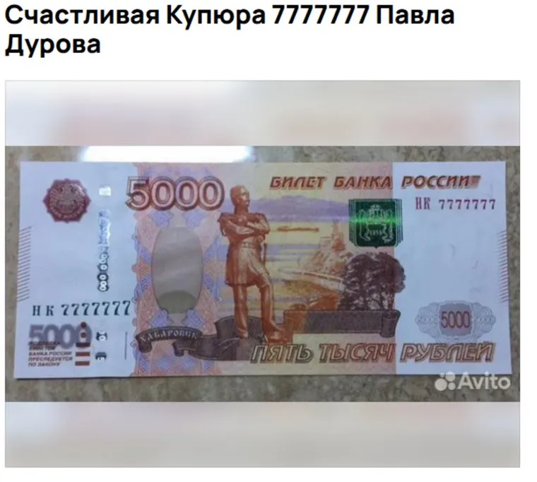 На сайте объявлений «Авито» появилось объявление с продажей купюры, которая была якобы сброшена сооснователем Telegram Павлом Дуровым из окна офиса «ВКонтакте» в Санкт-Петербурге более 12 лет назад. За пятитысячную банкноту с уникальным номером 7777777 продавец запрашивает 7,7 миллиона рублей.