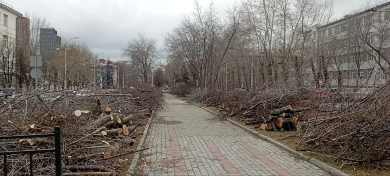 В Екатеринбурге на улице Мира вырубили аллею черемухи рядом с корпусом Уральского федерального университета, суворовским училищем и гарнизонным военным судом. Десятки уничтоженных деревьев заметил урбанист и общественник Дмитрий Москвин.