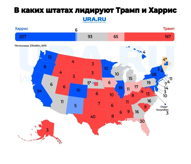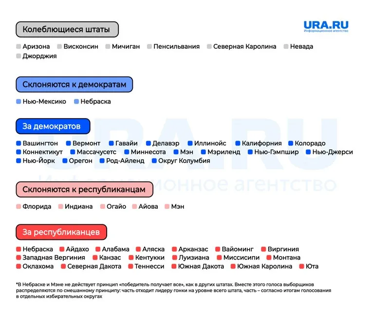 Примерно 240 миллионов американцев по всей стране имеют право голоса, однако исход выборов может определить всего несколько десятков тысяч избирателей в семи неопределенных штатах: Аризоне, Висконсине, Джорджии, Мичигане, Неваде, Пенсильвании и Северной Каролине. Победы в штатах, которые традиционно поддерживают демократов (таких как Калифорния и Нью-Йорк) или республиканцев (как Техас и Небраска), не позволят ни Трампу, ни Харрис достичь необходимого порога в 270 голосов. Для победы одному из кандидатов потребуется выиграть в неопределившихся штатах.