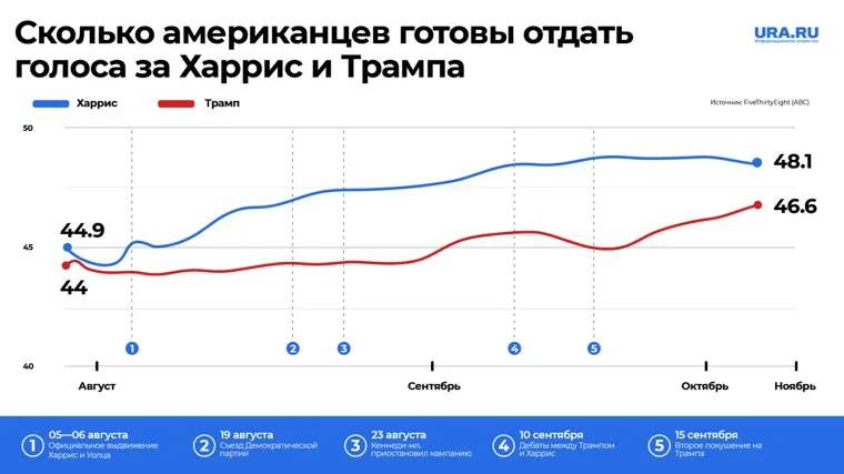 Кандидат Харрис смогла значительно укрепить свои позиции в предвыборной гонке, опережая Трампа. По данным портала FiveThirtyEight (одна из популярных моделей прогнозирования в мире спорта на данный момент), на 29 октября рейтинг вице-премьера США составляет 48,1%, что на 1,5 пункта выше, чем у Трампа, чей рейтинг равен 46,6%.