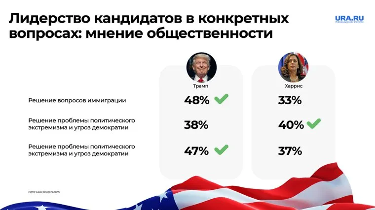Трамп также получил одобрение от населения в вопросах иммиграции. Экс-глава США выдвинул более жесткие предложения по решению возникшей в стране проблемы, подложив массовую депортацию нелегальных мигрантов. 48% избирателей выбрали его подход, 33% — Харрис.