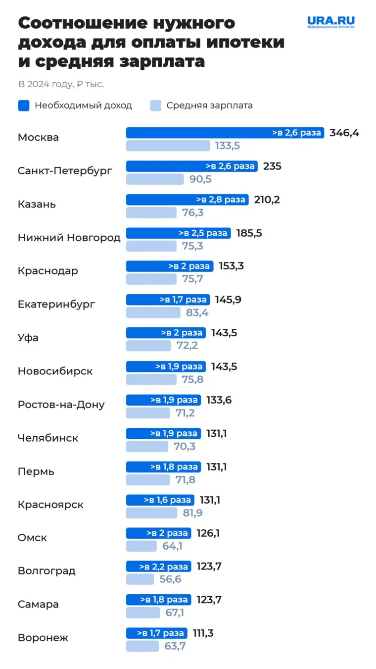 В крупнейших городах России наблюдается значительный разрыв между средними зарплатами и доходами, необходимыми для обслуживания ипотеки. Наибольшая диспропорция зафиксирована в Казани, где средняя зарплата составляет 76,3 тысячи рублей, в то время как для оплаты ипотеки на однокомнатную квартиру в новостройке требуется доход в размере 210,3 тысячи рублей, что в 2,8 раза превышает заработную плату.