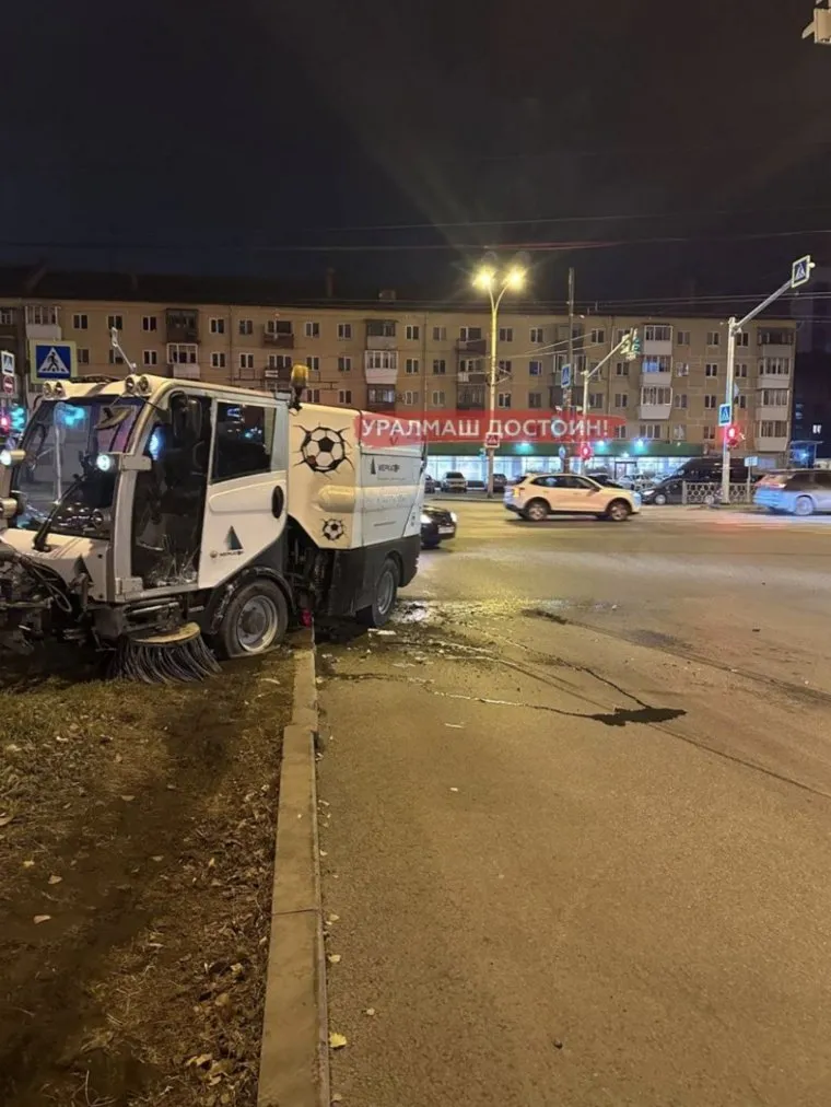 «Минувшей ночью на Космонавтов какой-то особо одаренный… врезался в машину уборки и уехал с места ДТП с водителем уборщика на капоте», — передает telegram-канал «Уралмаш достоин». Сама уборочная техника от столкновения съехала на обочину.
