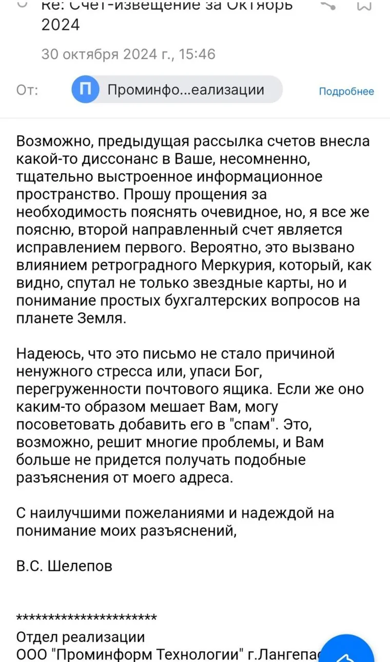 «Возможно, предыдущая рассылка счетов внесла какой-то диссонанс в Ваше, несомненно, тщательно выстроенное информационное пространство. Прошу прощения за необходимость пояснять очевидное, но я все же поясню — второй направленный счет является исправлением первого. Вероятно, это вызвано влиянием ретроградного Меркурия, который, как видно, спутал не только звездные карты, но и понимание простых бухгалтерских вопросов на планете Земля. Надеюсь, что это письмо не стало причиной ненужного стресса или, упаси бог, перегруженности почтового ящика. Если же оно каким-то образом мешает вам, могу посоветовать добавить его в спам. Это, возможно, решит многие проблемы, и Вам больше не придется получать подобные разъяснения от моего адреса», — гласил ответ Шелепова.