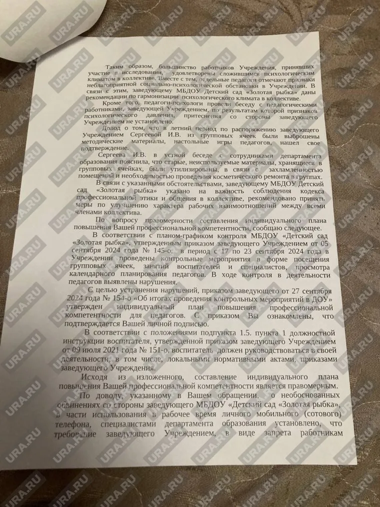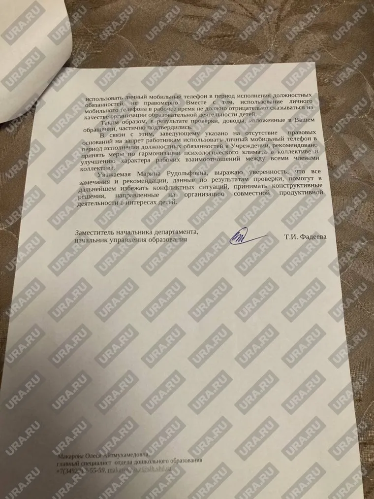 В заключении проверки, документ которой оказался в распоряжении редакции URA.RU, сотрудники департамента образования Салехарда заключили, что заведующей было указано на отсутствие правовых оснований на запрет использования личных мобильных телефонов работниками. А также заведующей порекомендовали принять меры по гармонизации психологического климата в коллективе.